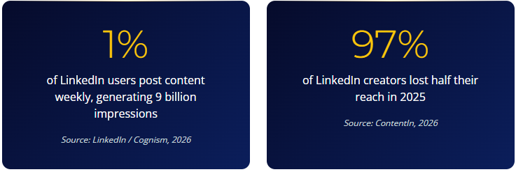97% of LinkedIn creators lost half their reach in 2025. The ones who kept it were not posting more. They were posting to the right people. The algorithm now rewards relevance, credibility, and consistency over volume. But “relevant” means relevant to people who already engage with you. If those people are all marketers, that is the room you are locked in.