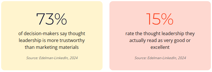 - Edelman-LinkedIn B2B Thought Leadership Impact Report (2024) – 73% of decision-makers trust thought leadership over marketing materials; only 15% rate it as very good or excellent