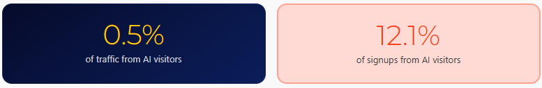 The quality of AI traffic is remarkable. Ahrefs reported that AI visitors generated 12.1% of signups despite being only 0.5% of traffic. The audience is smaller. It is vastly more engaged.