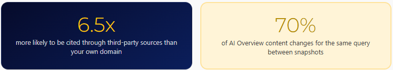 Brands are 6.5 times more likely to be cited through third-party sources than their own domains, according to Airops research from October 2025. AI Overview content changes 70% of the time for the same query, and nearly half of citations get replaced between snapshots.