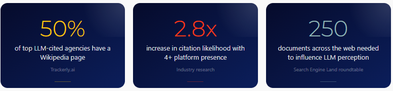 Brands appearing in Google’s Knowledge Graph have dramatically higher chances of being cited by Gemini. 50% of the most frequently LLM-cited agencies had a Wikipedia page, according to Trackerly.ai. Establishing entity presence across four or more third-party platforms correlates with a 2.8 times increase in citation likelihood.