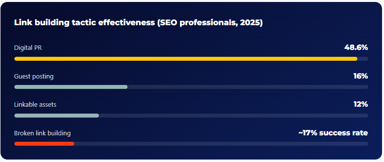 The industry has voted decisively. In Editorial.Link’s 2025 survey, 48.6% named digital PR the most effective link-building tactic, far ahead of guest posting (16%) and creating linkable assets (12%). This was the second consecutive year digital PR topped the rankings.