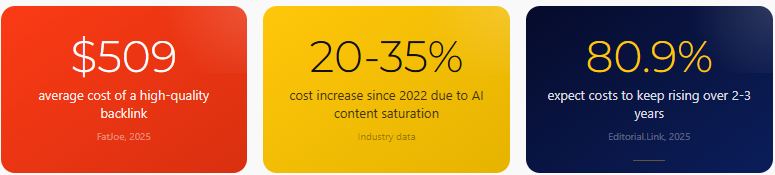 The average acceptable price for a high-quality backlink is now $508.95, with premium editorial links reaching $2,000–$2,500. Link building costs have risen 20–35% since 2022 due to AI content saturation and stricter editorial filtering. 81% expect costs to continue rising over the next two to three years.