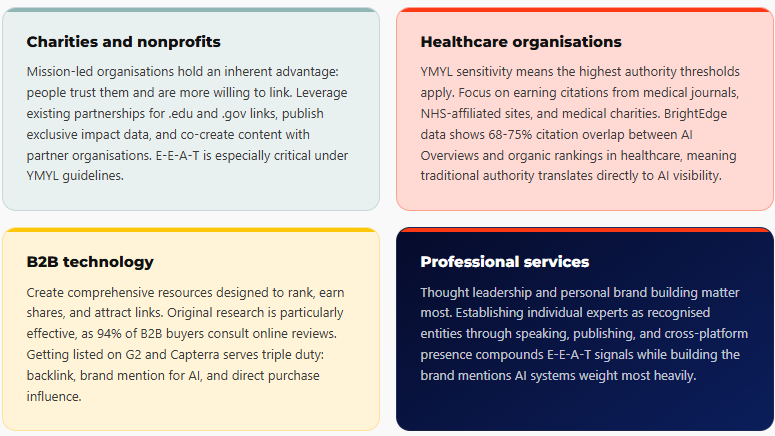 Healthcare and education organisations see 68–75% citation overlap between AI Overviews and organic rankings, meaning traditional authority translates strongly to AI visibility in YMYL categories. Charities and nonprofits benefit from natural trust signals and willingness to link. B2B technology companies benefit from original research and review platform presence. Professional services firms benefit from personal brand building and thought leadership.