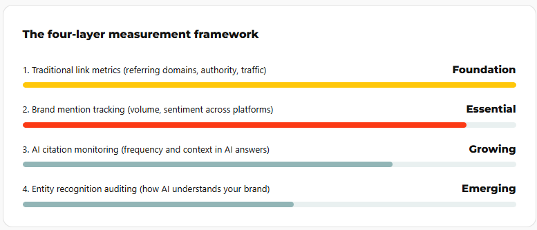 Track four layers: traditional link metrics (referring domains, authority scores, ranking improvements), brand mention tracking (volume and sentiment across web and AI platforms), AI citation monitoring (frequency of brand appearances in AI answers, now reportable in Google Search Console), and entity recognition auditing (how accurately AI systems understand your brand). Tools like Ahrefs Brand Radar, Chatbeat, and GA4 with ChatGPT UTM tracking make this measurable.