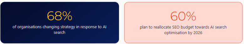 68% of organisations are actively changing their strategies in response to AI search, according to BrightEdge’s survey of 750+ marketers. 60% of marketing teams plan to reallocate part of their SEO budgets toward AI search optimisation by 2026.