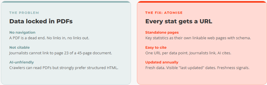 The fix: atomise your reports. Every key statistic should be its own linkable asset.