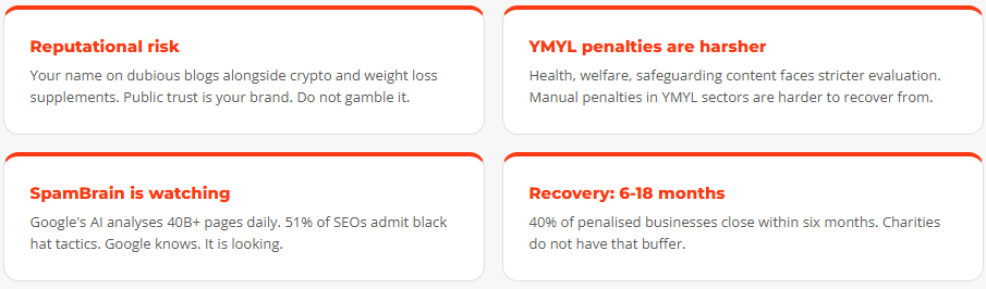 We do not buy links. We do not sell links. This is not just a moral stance. It is a practical one. The risk-to-reward ratio for charities is catastrophically bad.