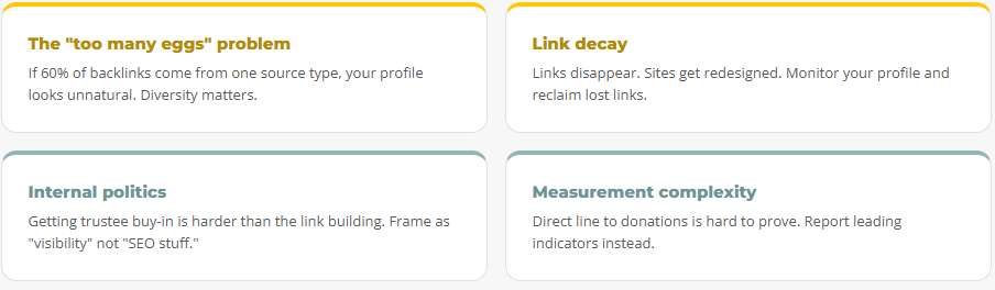 - Internal politics. Getting buy-in from trustees is often harder than the link building itself. Frame it as partnership development and visibility, not “SEO stuff.”