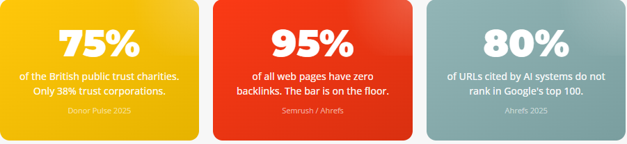 Link building remains one of the most effective ways for UK charities to increase visibility, attract donors, recruit volunteers, and get cited by AI systems like ChatGPT and Perplexity. Charities hold several natural advantages: inherent public trust (75% vs 38% for corporations), .org.uk domain credibility, original research data, and partnerships with high-authority institutions. Yet 29% of UK charities rate themselves as poor at maximising their website for visibility, and only 44% have a digital strategy at all. The gap between what charities have and what they do with it is staggering. This article closes it.