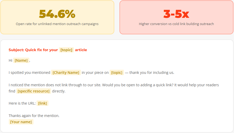The outreach template: Short, specific, framed as helpful. “I spotted you mentioned [Charity Name] in your piece on [topic]. Would you be open to adding a link? Here is the URL.” No essay. No sales pitch. The link is not a favour they are doing for you. It is a service you are providing for their readers.